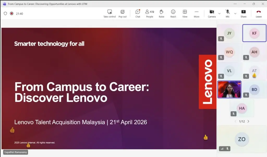 21 April 2026 – Faculty of Computing hosted a student engagement session with Lenovo, a global technology company known for its innovation in computers, devices, and digital solutions. The program, held online, is an engaging career readiness session aimed at helping students prepare for the transition from university to the professional world.
