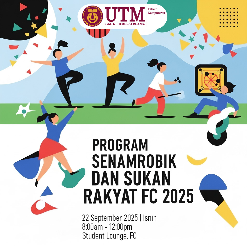September 22, 2025 @ 8:00 am – 12:00 pm – Assalamualaikum dan Salam Sejahtera Warga FCSempena menyambut Bulan Kemerdekaan dan Hari Malaysia 🇲🇾Sukacita dimaklumkan bahawa Fakulti Komputeran akan menganjurkan Program Senamrobik dan Sukan Rakyat FC 2025 seperti butiran berikut:Tarikh : 22 September 2025 (Isnin)Masa : 8.00 pagi hingga 12.00 tengahariTempat : Student Lounge, Aras 2, Blok N28, Fakulti KomputeranAktiviti Sukan Rakyat:🥏 Karom♟️ Dam Haji🪘Congkak🥥 Baling […]